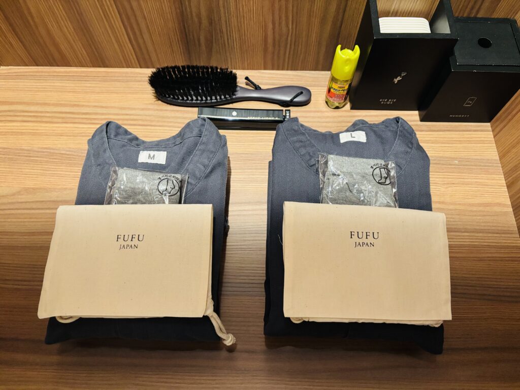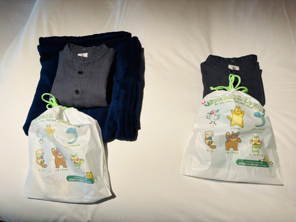 寝室横のクローゼットを開けると館内着と靴下が置かれています。巾着袋がとっても可愛かったです。