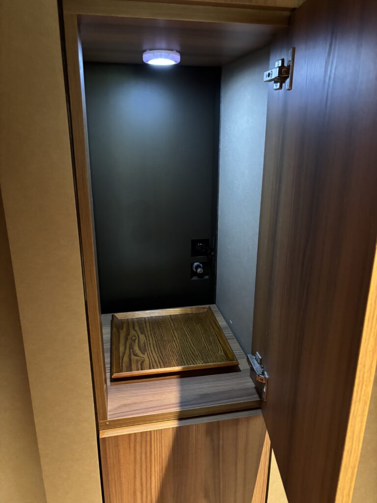タオル交換やハーブティーのおかわりが欲しいときなどに、このボックスに使用済みタオルや空になった容器を入れて右のボタンを押すと、スタッフの方が新しいタオルやハーブティーを用意して入れておいてくれます。