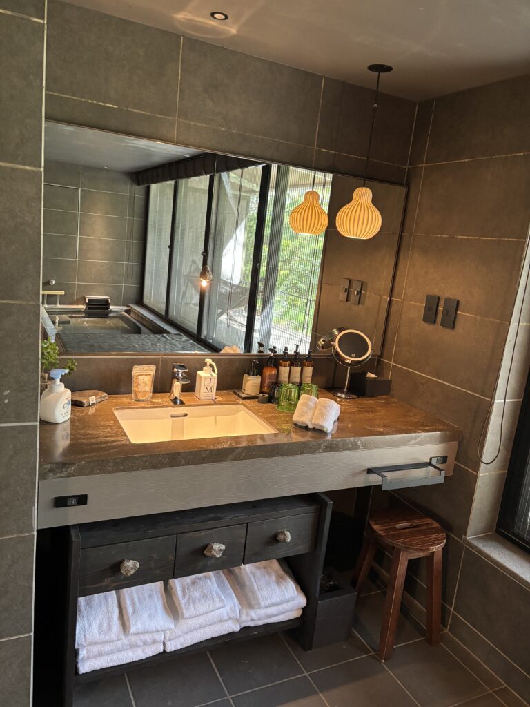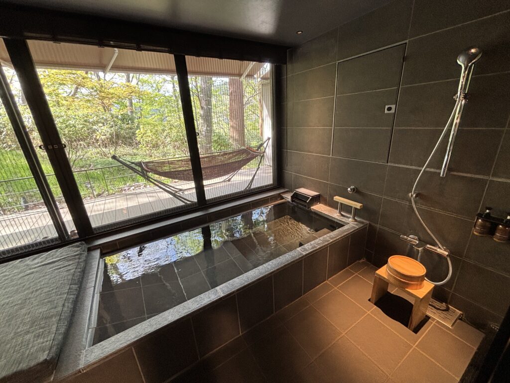このお風呂が本当に最高でした。お風呂に入りながら緑いっぱいの景色を見て、旅の疲れが一気に吹き飛びました。