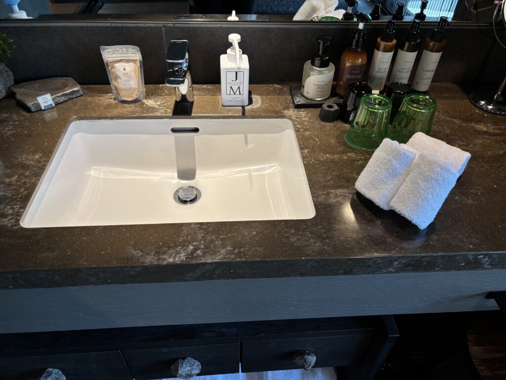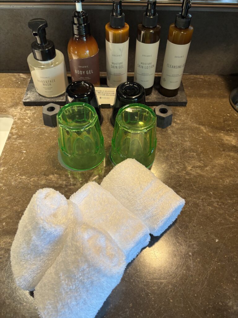 アメニティは洗面台に揃っていました。メイク落としや化粧品、乳液等はボトルで置かれています。