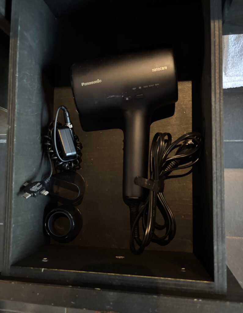 歯ブラシやシャワーキャップ、ヘアブラシ、ドライヤーなどは洗面台の下に収納されていました。