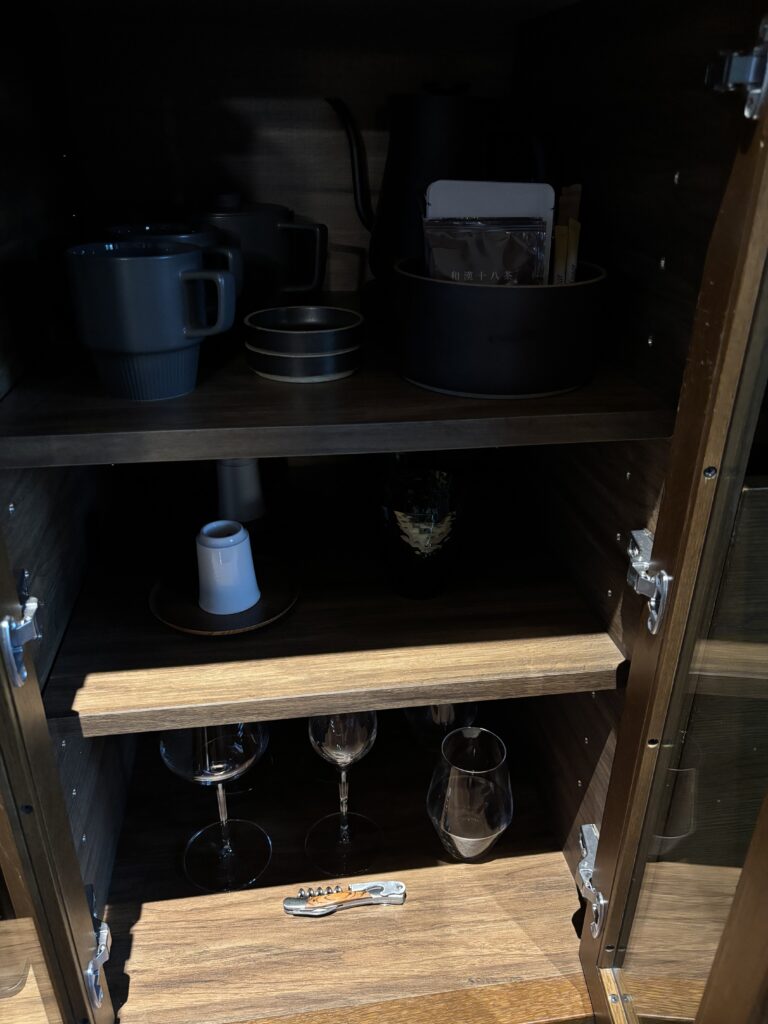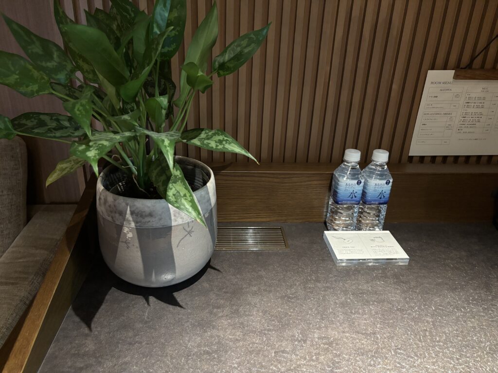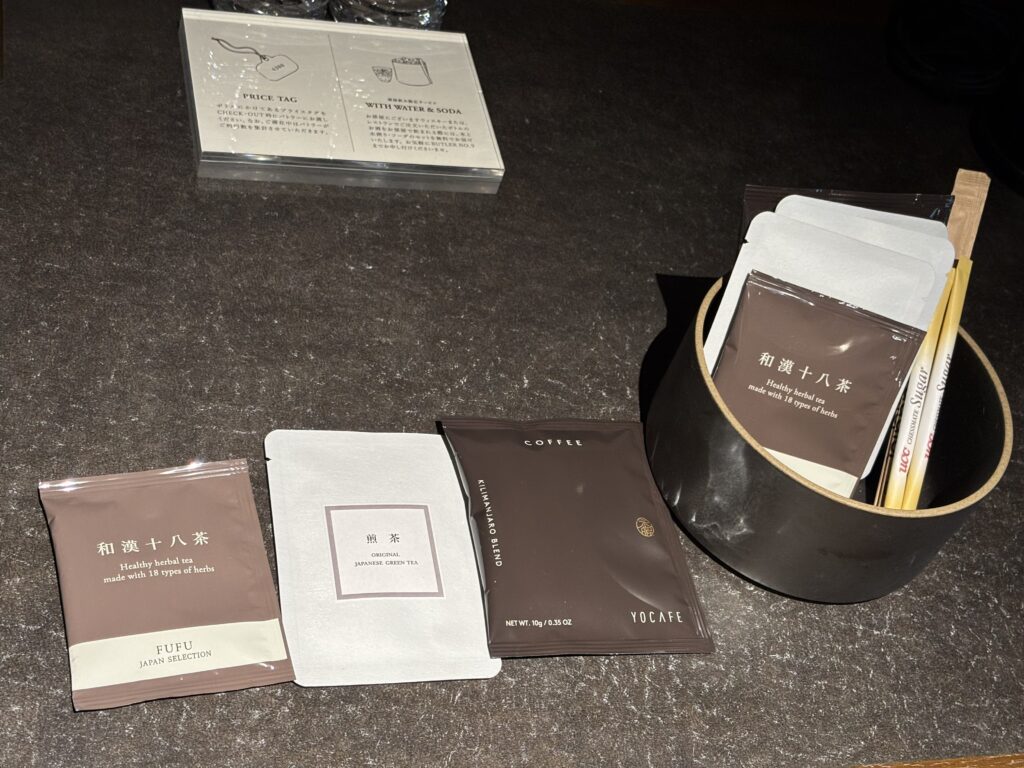 部屋にはペットボトルのお水のほか、ティーパックのお茶とコーヒーが置かれていました。