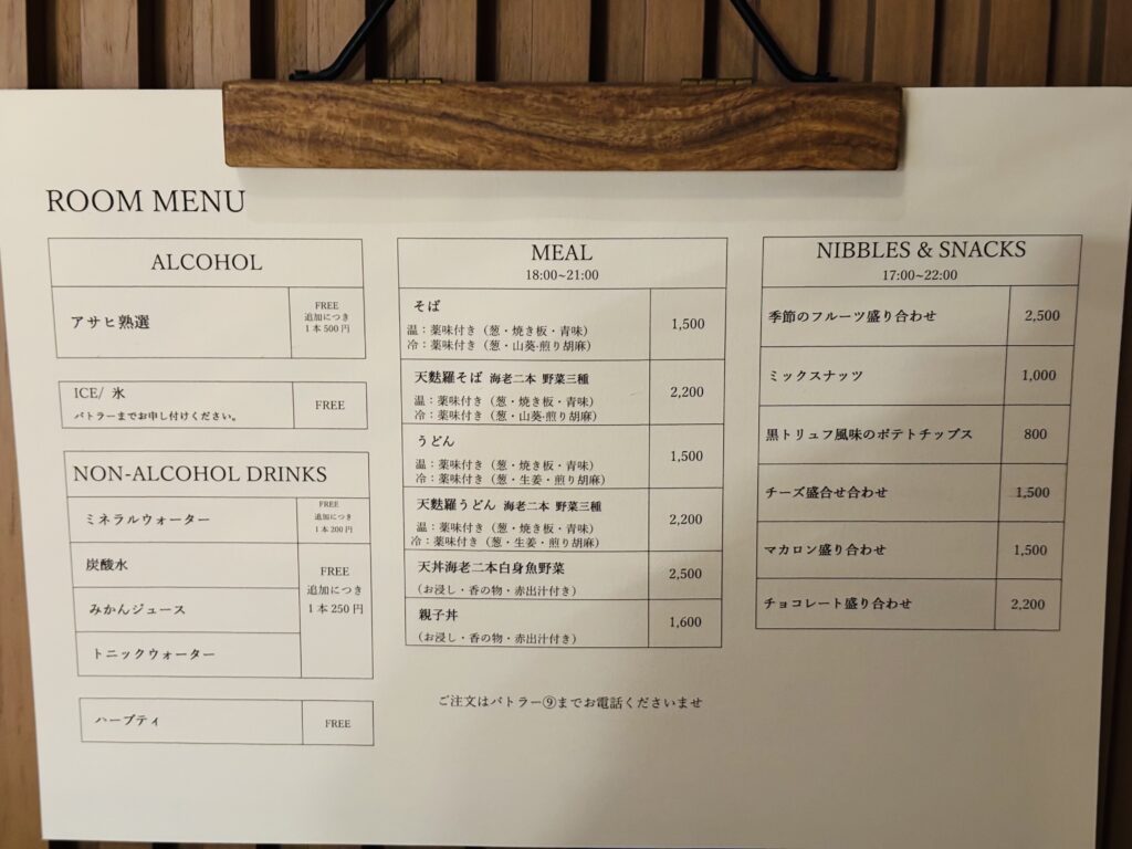 その他うどんやそば等の食事、デザートもお部屋から注文することができます。
