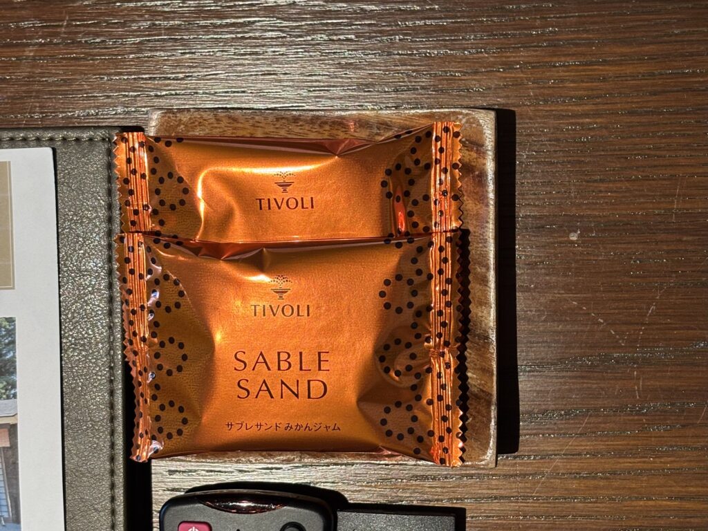 机にはサブレサンドのお菓子が2つ置かれていました。