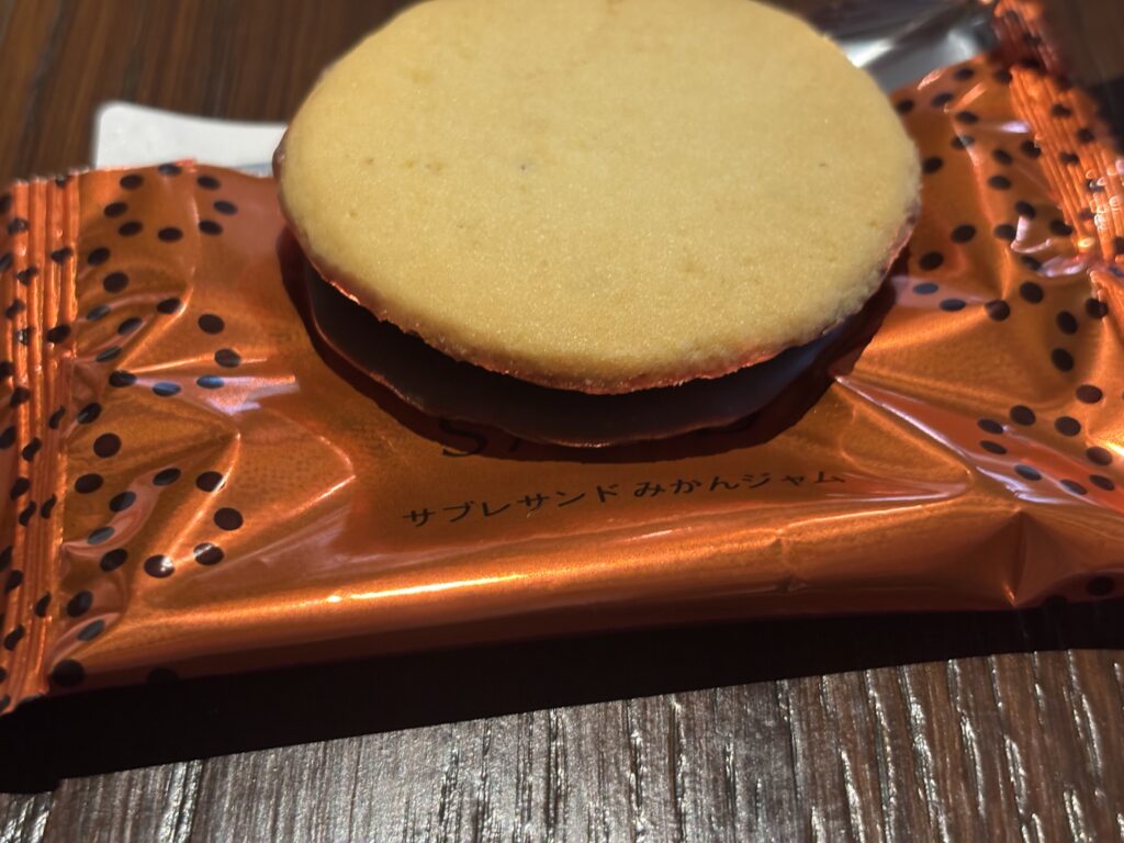 チョコレートをクッキーでサンドしたお菓子ですが、みかんの風味がしてとても美味しかったです。